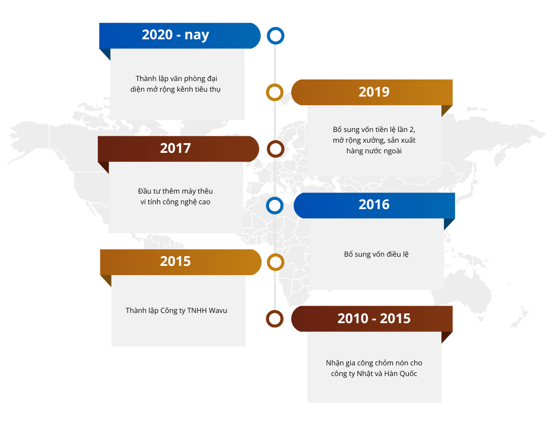 Tiền thân là xưởng may gia công nón cho công ty Nhật và Hàn Quốc. Sau nhiều năm hợp tác học hỏi được nhiều kinh nghiệm trong việc cho ra đời những sản phẩm chất lượng cao, ngoài việc may gia công chúng tôi cũng đã chủ động hơn trong việc nhận may các đơn hàng nón trong và ngoài nước.